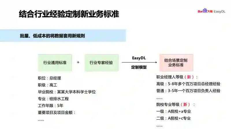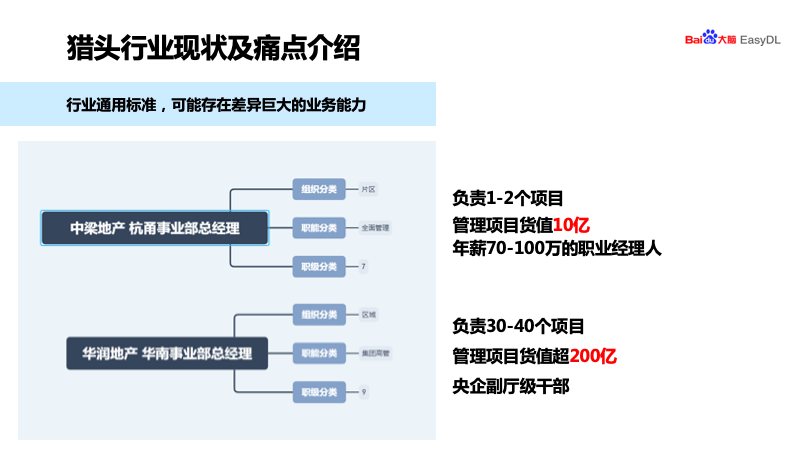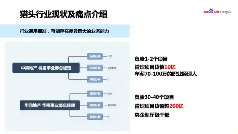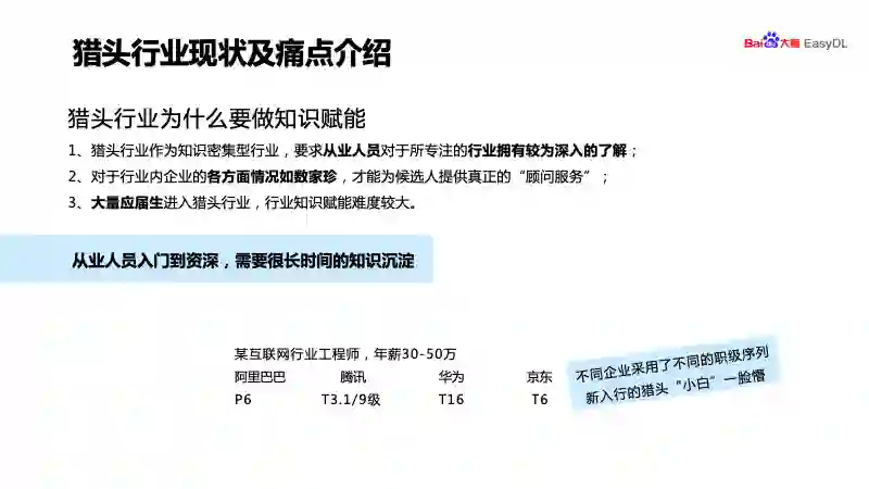 大家可以看下面这个例子,猎头行业会遇到一个问题:招聘过程中,同一个行业内不同的企业会采用不同的职级序列,以互联网为例,比如同样是年薪在30到50万的工程师岗位,可能阿里巴巴是P6级别,腾讯是T3.1,之后叫9级,华为叫T16,京东叫T6,这只是举个例子,可能内部会有不同的职级序列。而且,同一个职级序列,阿里巴巴有的叫工程师,或是专家,会有各种名字。在猎头招聘过程中就会面临一个从业者需要有足够长的时间,来积累行业经验,这样才能给到我们客户或者候选人提供全面的顾问服务。目前情况下,猎头行业目前变得门槛越来越低,大量应届生或者没有行业经验的人进入到这个行业,我们作为企业管理者或者团队领导人,需要赋能给这些新进入行业的小白。以前的言传带教在目前技术背景下变得越来越低效率,在这样的背景下,我们想到了EasyDL这个产品。