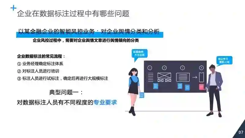 在这个过程中,我们发现有这么几个问题。首先,需要对标注人员有不同程度的专业要求。为什么会存在这个要求呢?还是回到金融企业智能风控业务当中,如果企业服务的客户是化工企业的客户,这个客户对应的企业舆情的文章,对它是正向还是负向,这个文章提到哪些点,是需要标注人员了解的,如果是这样的话,我们标注人员需要对他所在的业务,比如服务的化工企业,需要了解它的专业背景,如果是这样子的话,在培训的过程中,除了标注体系培训,还需要培训每个标注体系,每个标注标签背后的专业知识和概念,这样很大程度上都会让这些标注人员有一定的学习门槛。