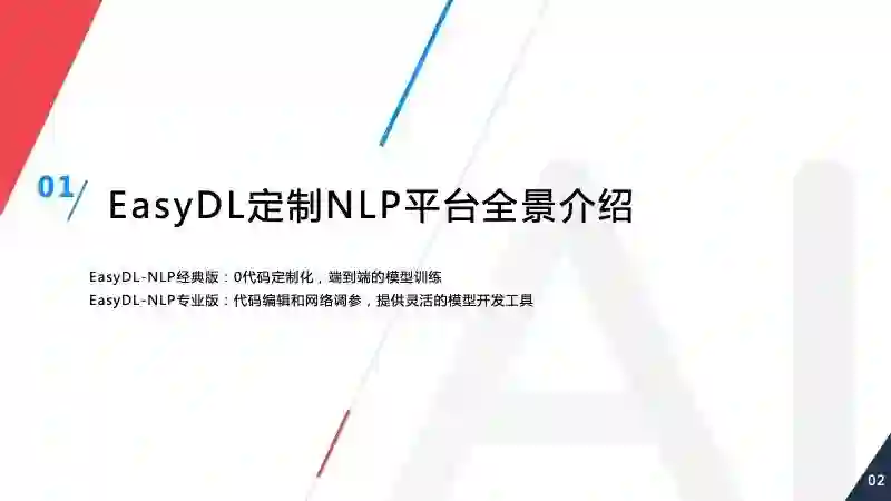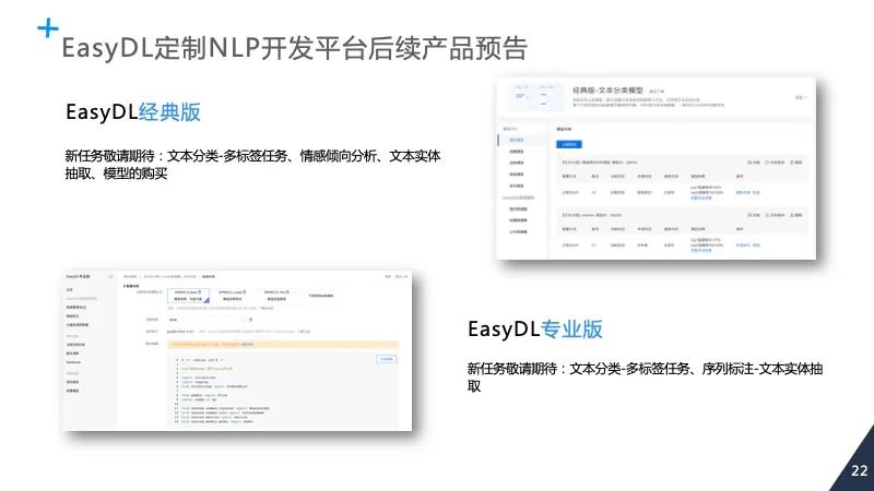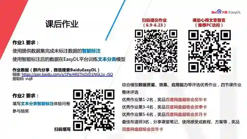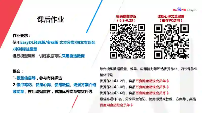 课程首先介绍了EasyDL在NLP方向的产品全景、之后介绍了一些文本智能标注的原理、应用和问题,以及对应的实操,最后介绍了一些NLP的任务应用场景是怎么做的,我们后续平台不管是经典版还是专业版都会陆续上线很多任务,大家可以后续可以持续关注。
