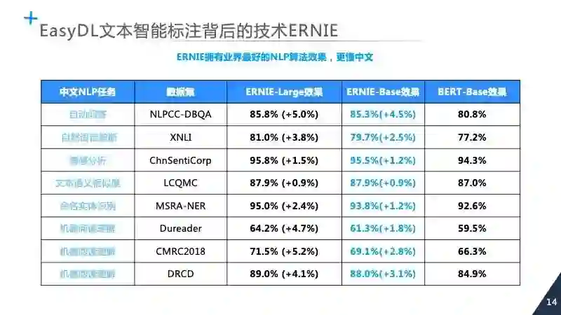 在ERNIE一些效果层面我们也做过很多评比,这个列表当中列出了关于在很多重要的国际级别的重要的比赛当中,ERNIE在一些常规数据集表现效果。我们在ERNIE效果上与BERT相比,评估提升了两个点。百度又对ERNIE增加了三倍参数的量,完成了ERNIE LARGE更大的模型,这个ERNIE LARGE也是文本智能标注核心应用的技术。所以说我们总结来说,ERNIE应该是目前拥有业界比较好的模型算法,更懂中文的语义理解框架。