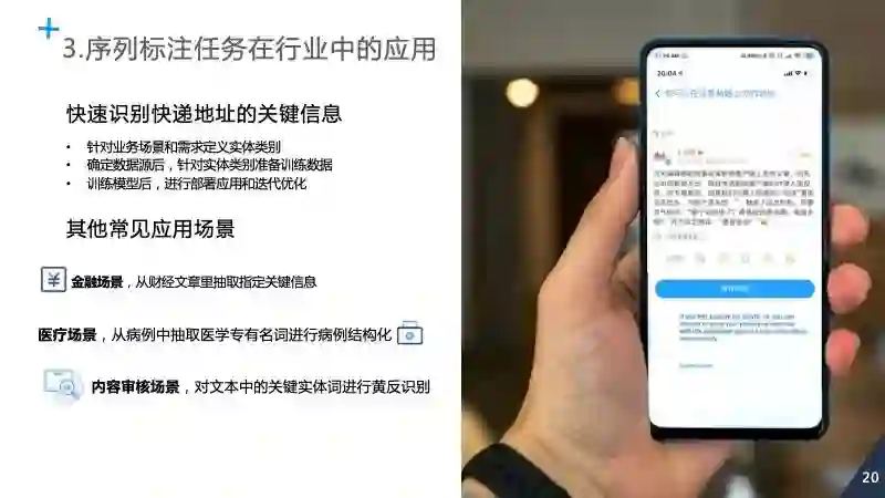 最后一个就是序列标注的任务,就是将文本看成一串序列,对序列字符进行标注,称之为序列标注,常见的应用就是快递地址的关键信息进行抽取,比如这里可以看到张三,电话号码,最后一个地址,我们把对应字段抽取出来就完成了序列标注的内容。序列标注其他的应用场景,我们在线下交流过程当中有很多的业务,一些公司也会应用到这个场景。你可以回想一下甲方或者客户那是不是也有这种场景,比如对一些财经文章抽取一些关键信息,进行结构化的录入,包括医疗专有名词的录入,这些场景是非常有商业潜力的,很多时候在AI落地的过程中,其实一些大型的国企或者政府企业会优先尝试这些能力,这个时候就诞生了一些订单,如果你回想出来自己的甲方或者客户已经有这种场景,但是还没有应用这种能力,就可以试一试在EasyDL智能标注的任务场景去构建一些模型。其他的场景,比如内容审核场景,都是对关键词识别以后进行的识别。