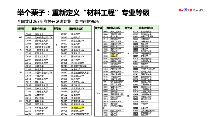这个例子举的是材料工程专业,这个专业据我在百度上查到的信息,全国有200多所高校开设这个专业。这个专业其实相对来说是比较偏门的行业,以至于它并不是像咱们所认知的,比如985是最强梯队,然后是211,然后是一本,然后是普通本科,因为这是相对冷门的专业,在教育不对各个专业有学科评估的,举个例子,武大985、211,是国内知名大学,昆明理工只是普通本科,但是教育部把它分为B类,武汉大学被分为B-类。这个说明什么,说明在产业或者业务应用中一些普适的标准并不能符合实际业务场景的标准,我们就可以通过EasyDL的能力,重新制定一个符合业务需求的标准。