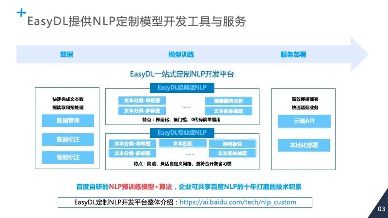 EasyDL整个平台的全景情况。目前,整个平台提供了一站式端到端的开发服务,也就是说从数据到模型训练到服务部署这个环节,都会提供相应的解决方案。在NLP这个方向也是两个版本,一个是经典版的模型训练平台,另一个是专业版。针对经典版提供了相对比较低门槛,并且可以在零代码的基础上训练文本的模型。目前可以使用的模型有文本分类,也会陆续上线文本分类多标签的任务类型,以及情感倾向分析,文本分析,文本实体抽取。专业版可以满足用户自己配置一些代码,可能有些自己开发的内容想加到预置的网络里,专业版平台也是符合开发工程师的习惯。与模型训练配套,我们也提供了数据的相关处理能力,比如说数据的管理,包括数据标注和本期着重介绍的文本智能标注。在服务部署方面也提供了发布到云端的API服务部署方式,再一个就是本地部署包的方式。