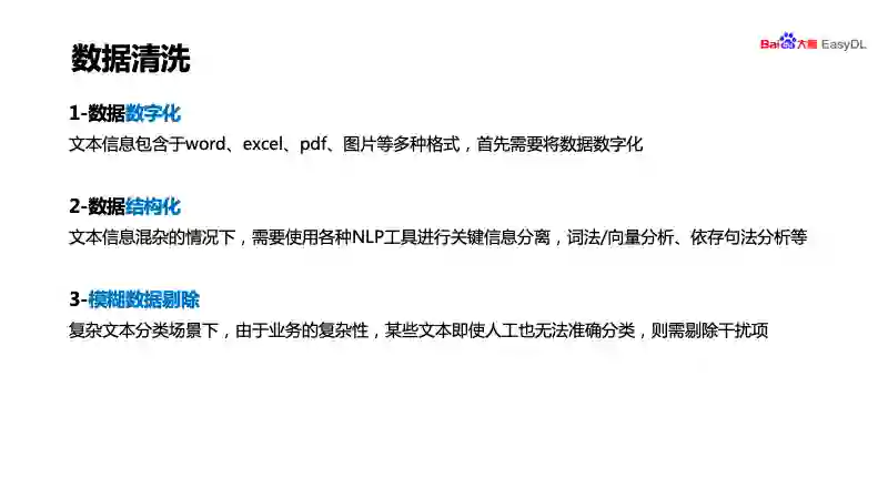 刚才举学校和专业的例子,这其实只是例子,可能我们业务场景中会更复杂,因为我们公司一定不会只招材料工程类的专业,我们可能有十个或者二十个专业方向,有的是word、excel、pdf或者图片,甚至面试时候有各种类型的录音,这种首先要进行数据清洗,才能作为文本分类使用,这个数据清洗,图片类的我们使用了百度AI平台上的OCR的功能,有一些表格OCR,高精度OCR,自定义模板OCR,在数据清洗上起到了非常大的帮助,以及pdf版本文件,可能需要通过一些其他的软件转换格式,以及一些音频文件也是用了科大讯飞的接口转换成文字,所有的语料都要先转换成文字,也就是说我这边提到的数据的数字化,这样咱们才能进行下一步操作。