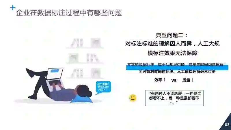 假设我们已经解决了培训的问题,花了一周时间,每一个标注人员都了解了标注标签了,就一定能很好地标注吗?这个恐怕还不行。在标注的时候,很多时候我们都会发现,标注标签理解因人而异,人工进行大规模标注的效果无法得到保障。因为文本的数据标注是属于认知层的范畴。相对图像来说,图像是感知层,图像显示是猫狗就有明确答案,文本就很难有非常直观的感受。大家可以看下面的例子。比如这句话,“有两种人不谈恋爱,一种是谁都看不上,另一种是谁都看不上”。如果是你第一次听这句话,如果马上反应过来这句话讲的什么意思,那是很厉害的。但是很多时候理解这句话的过程中,有一定阅读理解的时间。所以我们在文本标注的时候,很多时候都会产生因人而异的问题。