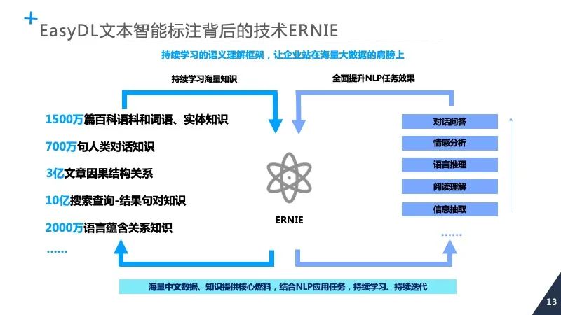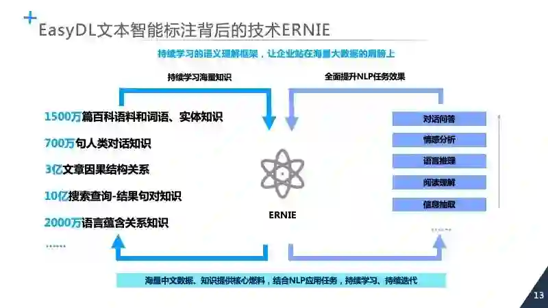 站在文本智能标注背后的技术,ERNIE2.0。我给大家介绍一下什么是持续学习的语义理解框架,就是ERNIE。首先就是这个左侧部分,ERNIE是不断通过学习人类的知识,结合一些典型的常见的NLP的任务,不断的去学习这部分的知识,这些海量知识包括了1500万百科语料或者词语,实体知识,还有人类对话的知识,文章的因果结构的知识,还有搜索查询的结果句对知识,还有语言蕴含的关系知识。这些知识在ERNIE已经完成了学习,但是它并仅仅限于此,它持续学习的框架还在不断学习,截止到现在它还是在不断拿到新数据,去学习我们人类的知识。在这个过程中,我们也是希望把我们比较强大的ERNIE持续学习的语义理解框架,通过一些产品的方法,让企业能够站在我们积累的海量的大数据能力之上应用NLP的模型能力。对应这个持续学习的语义理解框架ERNIE,如果大家想了解更细节的,或者想看一下ERNIE对应的论文或者是开源代码,可以上百度搜索ERNIE开源,就可以找到相应的链接。