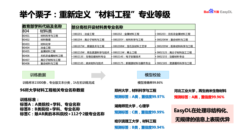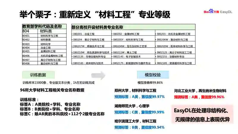 我再把这个事情加一个难度,可能这只是部分高校开设材料类专业的名称,还有很多材料类的专业名称并没有收录在这里,遇到了这样的简历,比如说我自己虚拟了一个专业叫再生纳米生物材料,这大体上是某一高校材料专业的名称,但是它并不存在于这些语料里,那怎么办,咱们规则也好,代码也好,程序也好,很可能大概率无法对这个专业进行正确的判定。我把刚才看到的这90多所学校以及这30多个专业作为语料放在EasyDL模型里训练出了三个标签,这三个标签就是ABC三个标签,A类院校是指屏幕上看到左边的,B标签的院校,加上学科的名称作为训练的语料,C标签就是除了AB两类,其他全国有900多所本科类院校,加上教育部拟定112个二级专业名称,作为C类标签进行训练,一共做了一万五千条训练数据,经过不到一个小时的训练,我获得了EasyDL文本分类的模型,这个模型在我前期已经做了验证,比如说我拿验证的文本是郑州大学材料科学与工程,大家可以看到它属于材料类专业,郑州大学属于B+的学校,它预测出来就是A类的标签,和A类标签的原始信息以及我希望达成的效果是一致的。又找了一个哈尔滨理工大学的材料工程,它是符合B类标签的规则,它在C+这个栏目里,它也准确地预测出来了它是B类的标签,C类我是拿湖南师范大学心理学进行预测,它不是材料专业,最后进入到了C类标签,最后我拿模拟出来的专业再生纳米生物材料,加上河北工业大学,河北工业大学是A类院校,加上拟定出来的并不属于30个原始语料里的专业,但是它依然有一个99.96%的置信度结果,结果是A类的标签,所以说明EasyDL在处理这种非结构化,没有规律的,甚至需要靠人类思维,预估,模拟思维才能出来的结果上,还是表现的比较好的。