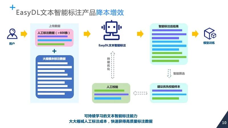在这个过程中也会不断去优化和迭代整个文本智能标注背后的标注能力,我们提供了第一批十万条,后续每天或者每周可以不断提供未标注数据,通过文本智能标注产品不断的进行智能标注。同时可以通过优化智能标注的流程,不断地去提升文本智能标注它的智能标注准确率,这样的话人工参与的成本或次数会越来越少。