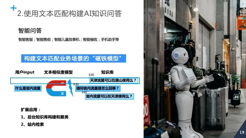 第二个场景是目前使用广泛的AI智能问答场景。例如智能客服、智能的故事机。这个过程背后核心技术就是这个文本匹配的模型。在文本匹配模型听起来比较抽象,我通过一个现实世界的例子给大家介绍一下在业务场景怎么应用。我们可以将文本匹配模型看成一个磁铁,当用户产生一个输入,“什么是天津省内的流量”,我们通过这个磁铁逐一看一下侯选的知识内容,它的对应值是什么,值是多少。请问省内流量是怎么回事,这个有相对比较高的数值,这个问题对应的答案可以解答这个问题,文本相似度的模型就在这个过程中起到了它的作用。如果在知识问答中可以使用,其他的场景还有什么,比如在业务当中很多时候需要对离线数据做知识库构建或聚类,也可以通过这种方式做。同时也有站内的搜索,比如我想像百度搜索框一样,直接提供答案。