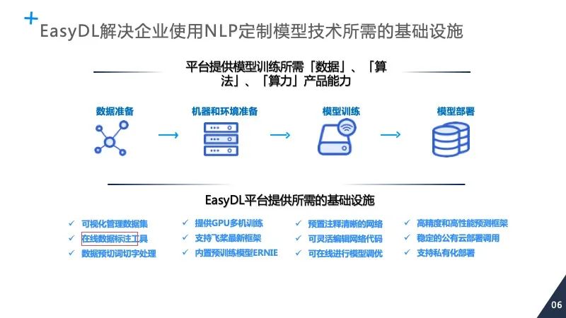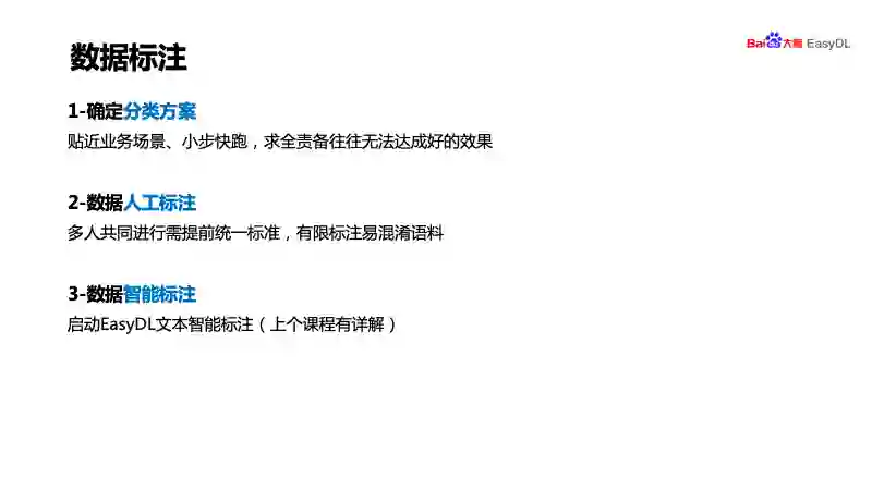 企业在使用NLP的定制模型时候如何集成这些AI认知能力。首先,在企业训练一个模型,集成自己AI能力过程中,核心三个要素是什么?目前在深度学习时期,普遍需要数据、算法和算力,针对这三个环节,平台也是提供了对应的产品能力,比如在机器和环境准备环节,我也看到群里也有一些同学问到怎么部署环境这样的问题,其实在平台这一侧我们集成了开发环境,包括一些训练的机器资源。在模型训练这一环节,百度NLP这边提供了非常高精度高性能的算法和网络,也会在这个基础之上允许用户进行一些灵活编辑;部署方面也会提供性能比较好的预算框架。但在线下和企业团队沟通过程中也发现,其实很多用都是在数据这个环节被卡住,为什么数据这个环节有这么多问题?具体在数据标注过程中,文本的数据标注具体会在哪几个问题阻碍企业应用NLP这种AI能力呢?