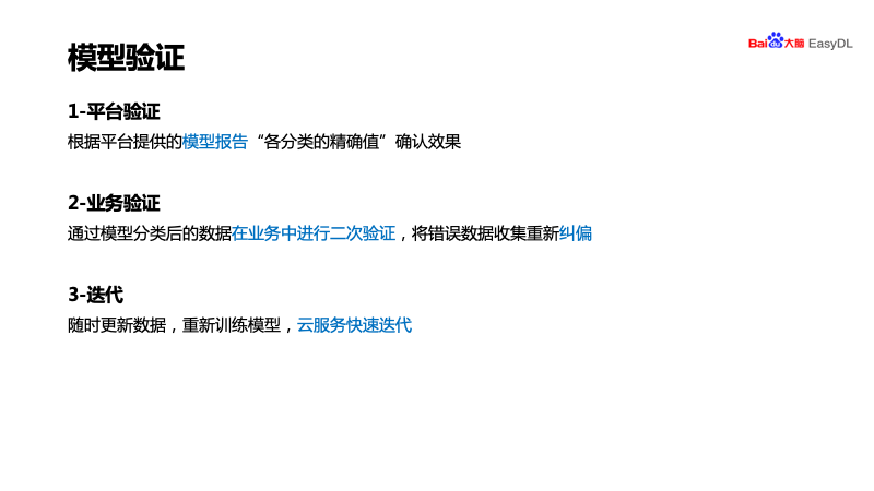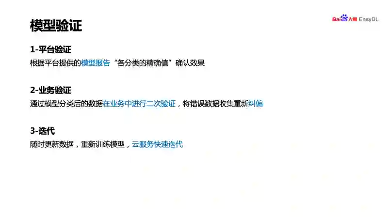 之后就是训练模型,一会有一个实操的演练。模型训练以后就是模型验证的工作,首先平台会提供模型的验证报告,它会给出各个分类的精准值。从我这边实际的经验来讲,可能不一定准,可能这只是符合我自己的实际经验,到其他行业和场景可能不应用了,如果准确值低于90%这就是非常不准的模型,可能需要重新分类或者看分类数据是不是有问题。基本上到95%是属于可以使用的模型,我们迭代到最后两三个版本,它的准确率基本上能达到99%,所以如果专业版准确度没有95%以上,基本上你这个模型就是失败的模型。可能98、99%的模型做出来以后,其实在业务中还是需要进行第二次验证,将验证出来可能有错误的数据再重新收集,重新人工再打或者分类,重新投入到模型训练的语料中,重新训练,这样这个模型的准确度,在复杂场景下模型的准确度能从98%提升到99.5%以上,基本上这就是模型验证。