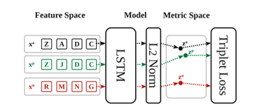 我们的目标是学习一个嵌入函数,它将符号标记序列从特征空间映射到度量空间,从而使语义相似的序列彼此映射得更近,而非相似的序列则相距更远。这背后的一般思想被称为度量学习。近年来,人们提出了基于三元体神经网络的深度学习方法来学习这种嵌入函数。三元体神经网络通过优化输入三元体网络上的排名问题来学习度量标准。三元体网络由锚点序列、正序列和负示例组成。这三个例子通过相似度关系相互关联,也就是说,正面的例子应该比反面的例子更类似于锚点的例子。三重网络训练学习一个函数,该函数将实例嵌入度量空间,其中正序列比负序列更接近锚点实例。