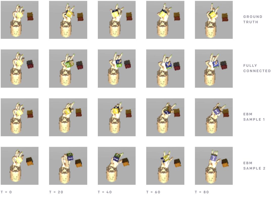 除了生成图像,作者发现基于能量的模型在大量时间步骤上能够生成稳定的机器人动态轨迹。虽然前馈模型不能做均值预测,EBM 却能够生成一系列不同的可能性。