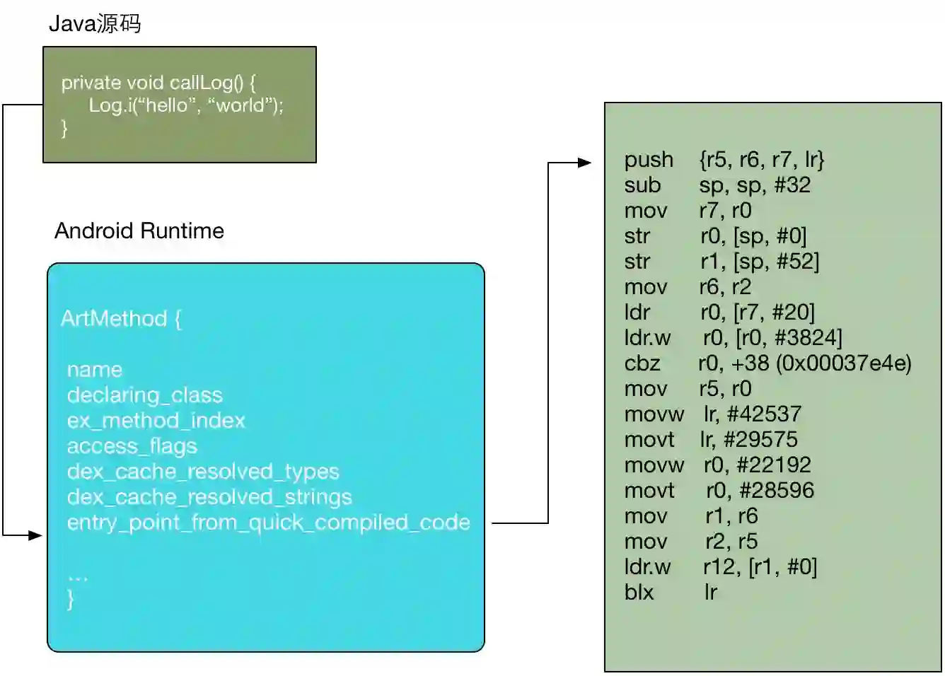 首先简单介绍下 ART 上的方法调用原理(本文不讨论解释模式,所有 entrypoint 均指 compiled_code_entry_point)。在 ART 中,每一个 Java 方法在虚拟机(注:ART 与虚拟机虽有细微差别,但本文不作区分,两者含义相同,下同)内部都由一个 ArtMethod 对象表示(native 层,实际上是一个 C++ 对象),这个 native 的 ArtMethod 对象包含了此 Java 方法的所有信息,比如名字,参数类型,方法本身代码的入口地址(entrypoint) 等;暂时放下 trampoline 以及 interpreter 和 jit 不谈,一个 Java 方法的执行非常简单: