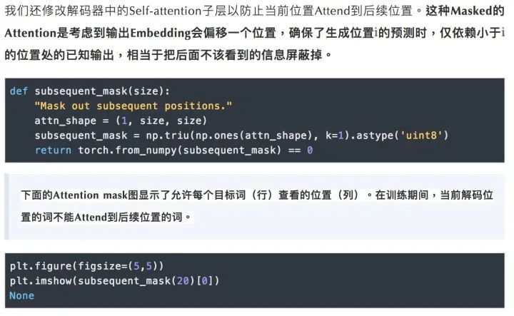 3) 类似的,解码器中的Self-attention层允许解码器中的每个位置Attend当前解码位置和它前面的所有位置。这里需要屏蔽解码器中向左的信息流以保持自回归属性。具体的实现方式是在缩放后的点积Attention中,屏蔽(设为负无穷)Softmax的输入中所有对应着非法连接的Value。