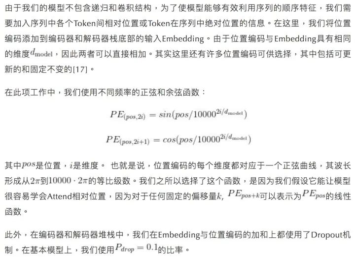我们也尝试了使用预学习的位置Embedding,但是发现这两个版本的结果基本是一样的。我们选择正弦曲线版本的实现,因为使用此版本能让模型能够处理大于训练语料中最大序了使用列长度的序列。
