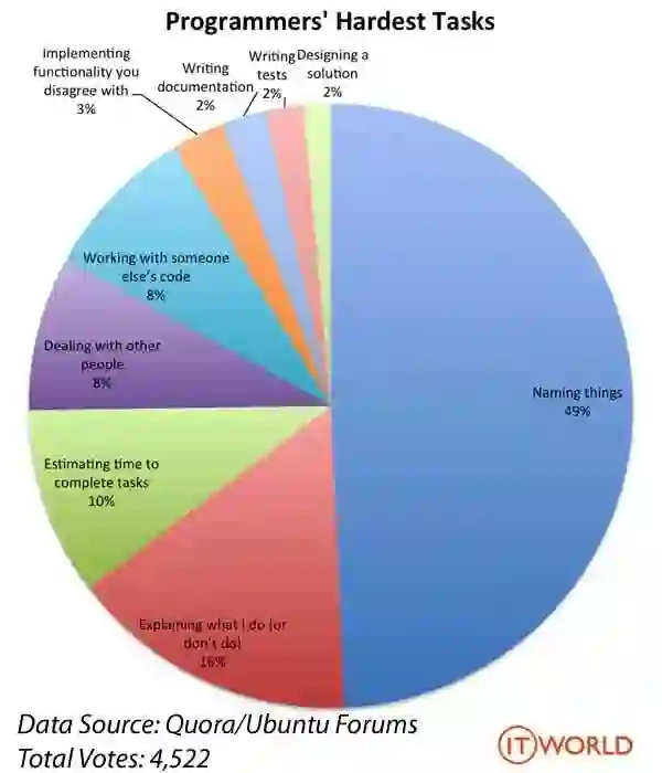 ITWorld 曾经发起过一个“程序员最头疼的事情”投票,结果,近半数的程序员认为命名是最头疼的事情。