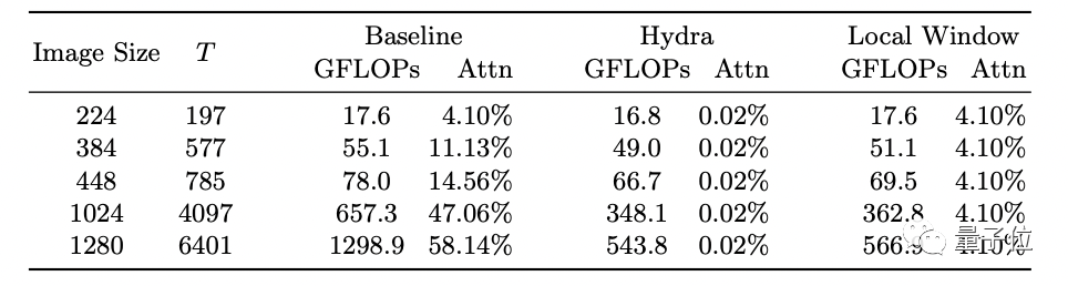 随着图像大小的增加,它显著提高了模型的FLOP数,在创建和应用注意力矩阵所占的计算量上也始终只有0.02%。