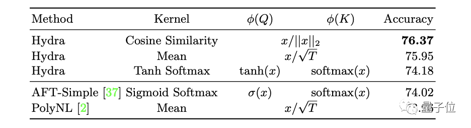 除此之外,作者发现,使用不同的内核,Hydra Attention还能让模型的准确率提高大约两个百分点。