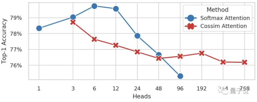 作者在ImageNet-1k上训练了具有不同头数的DeiT-B模型,包括使用标准自注意力(蓝线,基于softmax)和使用多头线性注意(红线,基于余弦相似性)的。