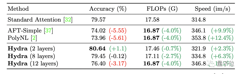 或者用Hydra Attention替换特定的注意力层,也能将模型的精度在ImageNet上提高1%或者与基线维持不变。
