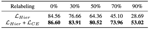 我们对比了 4 种公认的层级多粒度分类方法:HMC-LMLP[1] 、HMCN[2]、Chang et al.[3]、C-HMCNN[4]。我们汇总平均在各个数据集、不同重标记比例下各个对比方法的 OA / 结果在表 4 中:
