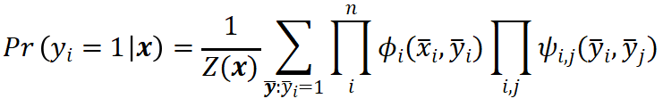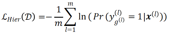 分析边缘概率的计算公式,我们可以发现:(1)图中某个标签 的边缘概率依赖于该标签所有的父类节点分数值之和,因为该标签赋值为 1 则其所有的 父节点都应该赋值 1 才能满足层级约束关系。因此,边缘概率的计算可以使得父节点的 分数值影响子节点的预测值。(2)计算层级中间标签的边缘概率时需要包含其所有子类标签对应的联合概率,即可以聚集来自子类的知识。最后,给定 m 个训练样本