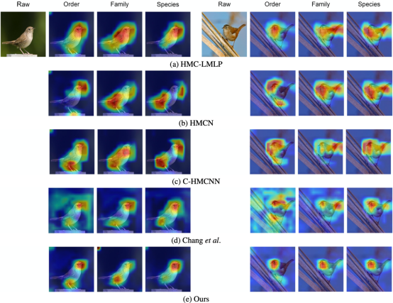 图 5: CUB-200-2011 数据集中来自同一目 (order: Passeriformes) 同一科 (family: Troglodytidae) 下面两种种类(左边: House Wren,右边: Marsh Wren) 的鸟类图片上,不同对比方法在三层层级 上各自的感兴趣响应区域示例