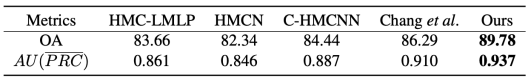 我们采用两套实验指标进行评价:衡量每个层级的准确率(OA)以及层级分类中的常用指标