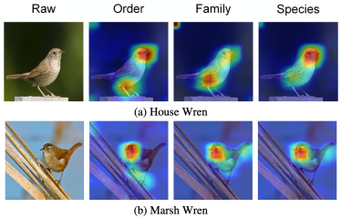 图 4: 鸟类数据集上来自同一目 (order: Passeriformes) 同一科 (family: Troglodytidae) 下面两种 种类 (species: House Wren 与 Marsh Wren) 的鸟类图片上,我们方法产生的二维激活热力图