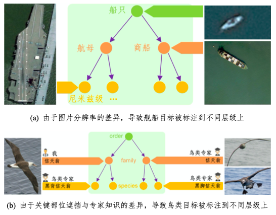 在图 1 中,标注人员需要借助鸟类专家的知识才能辨认黑脚信天翁与黑背信天翁,拥有一般鸟类知识的人员或许会将这两种鸟类归类为信天翁,而缺乏鸟类知识的人员可能只会将这两种鸟类归类为鸟。类似地,标注人员需要借助军事舰船专家的知识才能有效区分尼米兹级航母与企业级航母,而缺乏相关背景知识的人员可能会将这两类舰船归类为航母。也就是说,同一张图片会被拥有不同背景知识的标注人员标注到不同层级粒度的类别上。