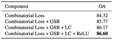 表 1:通过逐步添加 HRN 网络中的关键部分: 层级专有特征提取层 (granularity-specific block, GSB)、层级间特征的线性组合(linear combination, LC)、以及最后对于组合特征的非线形变换 (ReLU) 获得 CUB-200-2011 数据集中最后一层级上对应重标记比例为 0% 的 OA(%) 实验结果。