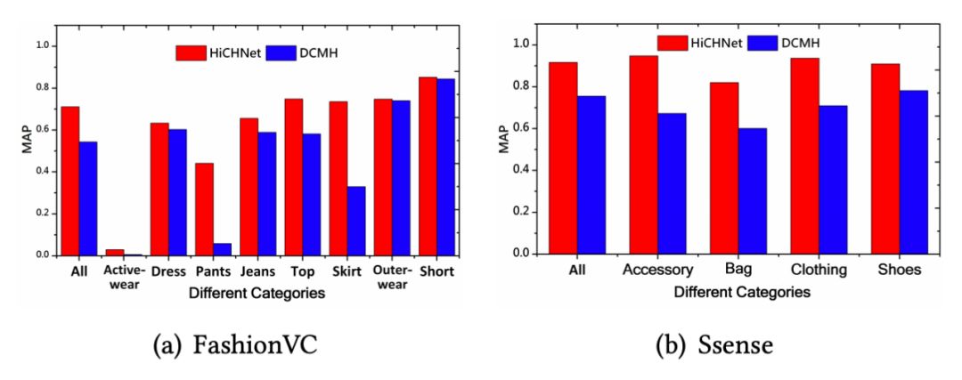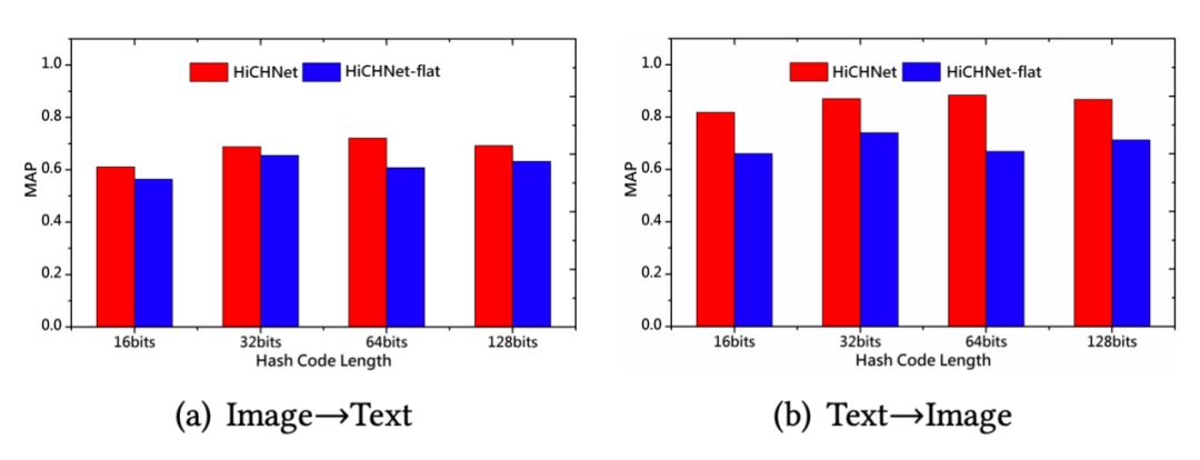4. 为了更好地证明层次标签的有效性,作者对所提出的模型进行了简单的变形,即不再考虑层次,只保留最细粒度的类别对应的判别性学习和正则化跨模态哈希,命名为 HiCHNet-flat。并在数据集 FashionVC 上比较模型 HiCHNet 和 HiCHNet-flat 的性能,结果如下图所示。从图中可以清楚地看出,无论哈希码长度设置为多少,HiCHNet 的性能始终优于 HiCHNet-flat,这再一次验证了考虑标签层次结构的必要性。