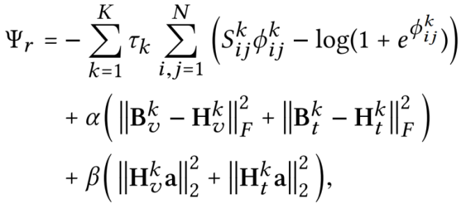 为了更好地在汉明空间中保持这种关系,作者希望当层次相似矩阵值为 1 时,最小化实例哈希码在该层上的汉明距离;当值为 0 时,则最大化。在模型的完整训练过程中,哈希表示可以充当哈希码的连续化代理表示。因此作者利用第 k 层的哈希表示的乘积来表明相应图片和文本在第 k 层的语义相似性,通过最大似然函数实现相似关系的保持。经代数转化,可以得到如下的目标函数: