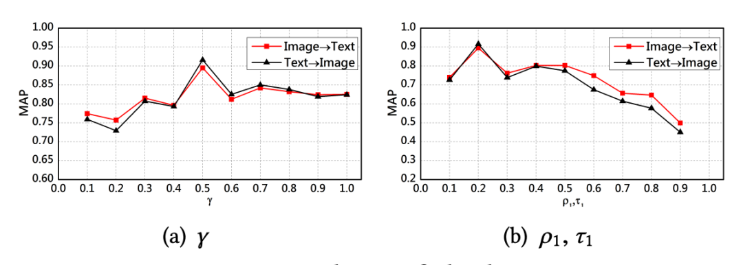 此外,作者将目标函数的两部分中的层次置信度统一起来,取 0.1 作为步长,将 ρ1 和 τ1 的值从 0.1 同时变化到 0.9,观察模型性能在数据集 Ssense 上的变化,结果如下图 (b) 所示。从图中可以发现,当 γ 值为 0.5,ρ1 和 τ1 的值为 0.2时,模型取得最优性能。