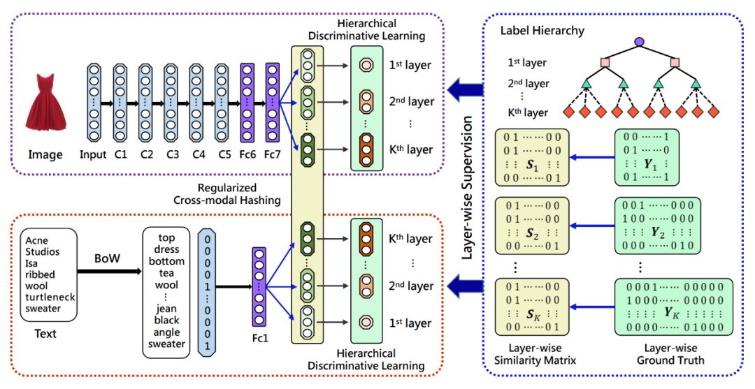 该框架由一个端到端的双路径神经网络组成。其中,每条路径分别代表一种模态。为了充分利用预先建立的标签层次结构,作者首先使用一组“分层哈希表示”来表征数据的模态特征,这些表示对应于不同粒度的类别。