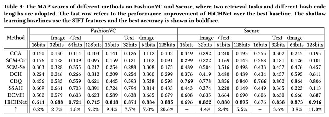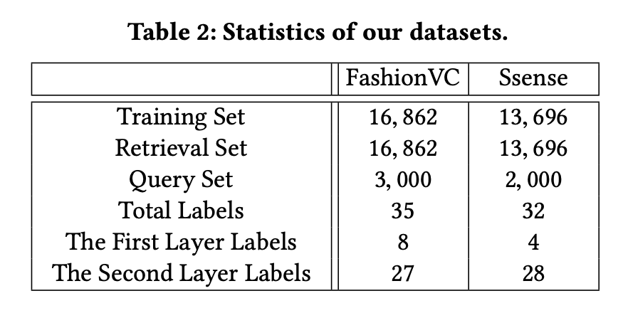 作者在两个具有层次标签的数据集 FashionVC 和 Ssense 上进行了实验。其中,FashionVC 为现有公开的数据集,作者对其进行了预处理,使其符合实验的要求,由 35 个层次类别标记,包含 19862 个图片-文本对;Ssense 是本文作者从时尚平台 Ssense 上爬取,经预处理获得 15696 个图片-文本对,该数据集由 32 个层次类别标记。关于数据集的统计信息如 Table 2 所示。