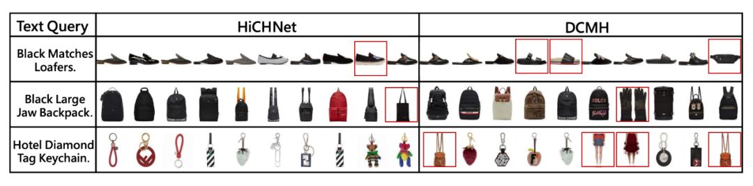 与基准方法 DCMH 作对比,列举返回 Top-10 的排序结果,上述两种设置的实验结果分别如下图所示。从第一个图中可以看出,作者提出的模型不仅返回的不相似图片(红色框标出)较少,而且不相似的图片被排在相对较后的位置。