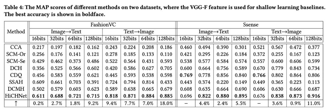 从上面两个表格可以看出,在两个数据集上,对于两种检索任务,作者所提出的模型的检索性能优于基准方法,证明了使用层次标签监督跨模态哈希训练时的优越性。