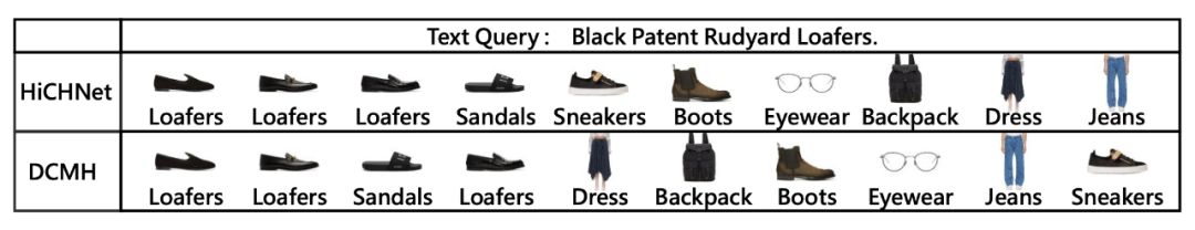 此外,从第二个图中可以看出,本文提出的 HiCHNet 返回的图片列表与查询文本更相关。同时,可以发现与查询文本共享相同类别的层数越多的图片的排名越靠前。例如,尽管类别“Sandals”“Sneakers”、“Boots”与类别“Loafers”属于不同的细粒度类别,但由于它们拥有相同的粗粒度类别“Shoes”,因此,属于类别“Sandals”“Sneakers”、“Boots”的图片被排在类别“Eyewear”、“Backpack”、“Dress”和“Jeans”之前。