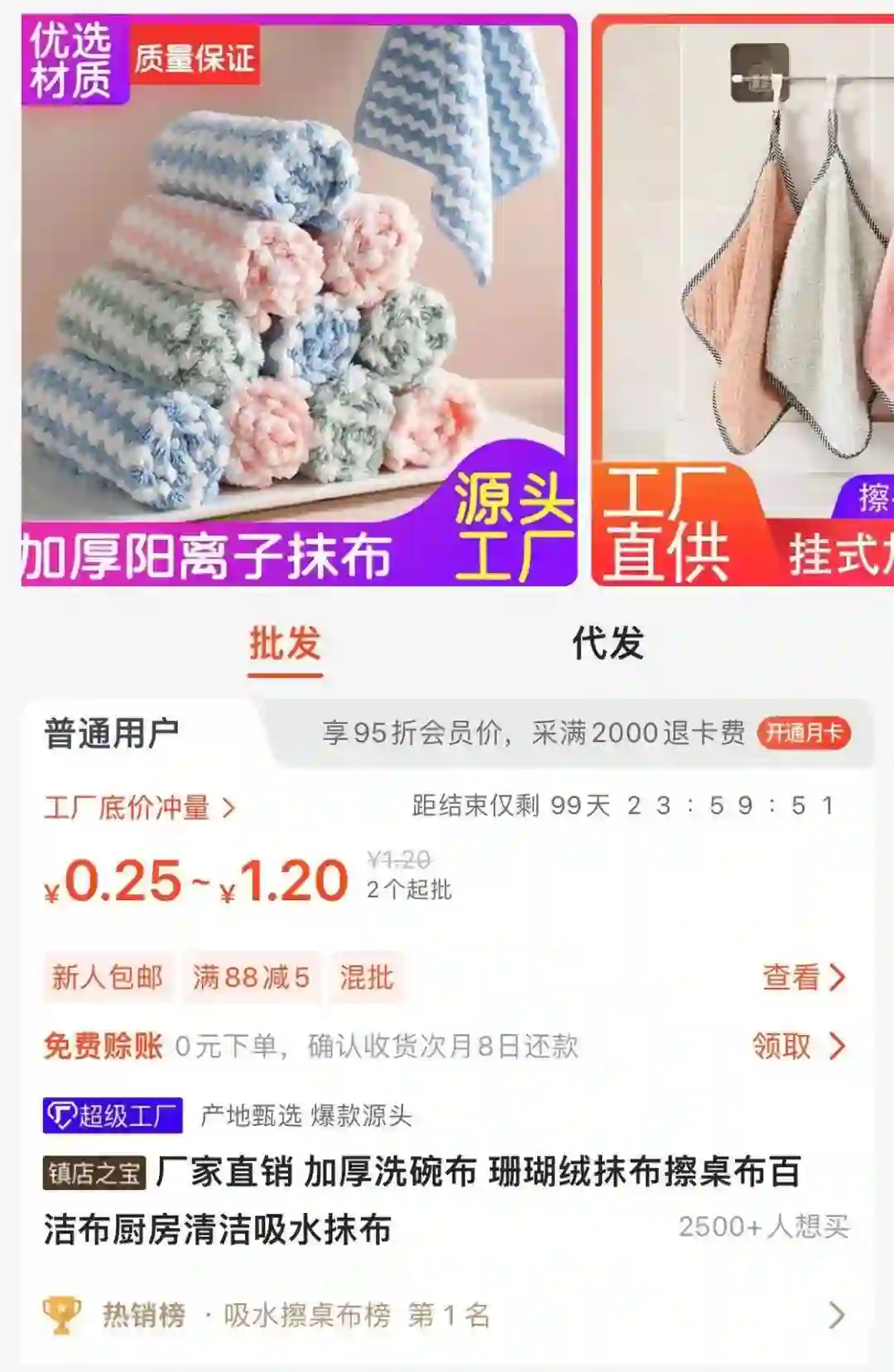 有一些产品不像垃圾袋一定要随时丢弃,但单个使用周期还是非常短,需要时不时更换。有可能到特定季节需要更频繁地更换,比如之前提到的吸湿盒;也有可能是产品体验会随着使用时长急剧下降,比如厨房抹布。厨房油污很多,抹布用得太久,纤维老化或是逐渐浸润了油脂,就会开始擦不干净,也会出现卫生问题。1688 上厨房清洁类的商品很多,专门的厨房抹布一块才几毛钱,吸水性也很好,更换的时候完全不肉疼,放在超市可能就要五六块钱。