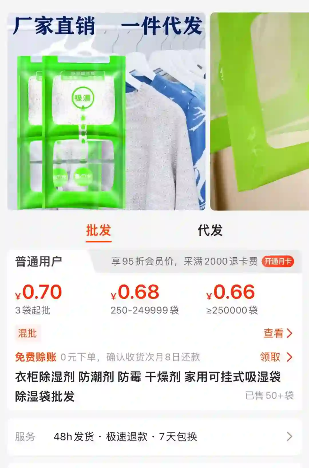 举个例子,我在南方经常要用的除湿袋,在 1688 上的价格是 0.7 元一包,购买超过 250 包,会便宜到 0.68 元。而在当地超市买到的同款至少一包 2 元,有些网购平台甚至要 5 元一包。