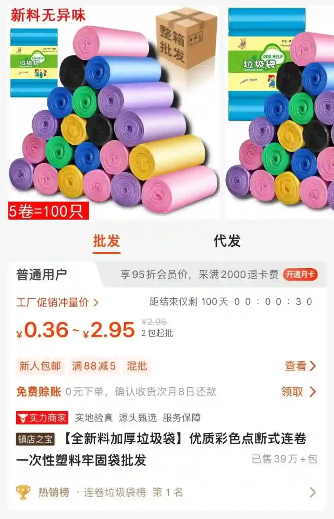有一些生活消耗品常常需要大量囤货。除了我之前提及的除湿包,还有一个我反复购入的必需品——垃圾袋。垃圾袋基本上一天一个,在超市里买的一卷很快就用完了,就还需要再去买,这东西突然告急不只是身边垃圾没办法清理,心情也会随着桌面的混乱变得更糟糕。考虑到材质,垃圾袋完全可以大批量囤货。1688 上随手一搜就有很多便宜且质量不错的垃圾袋。除了图中的这种平口垃圾袋,也有背心式的垃圾袋和抽绳的垃圾袋,都比从超市临时购入便宜得多。
