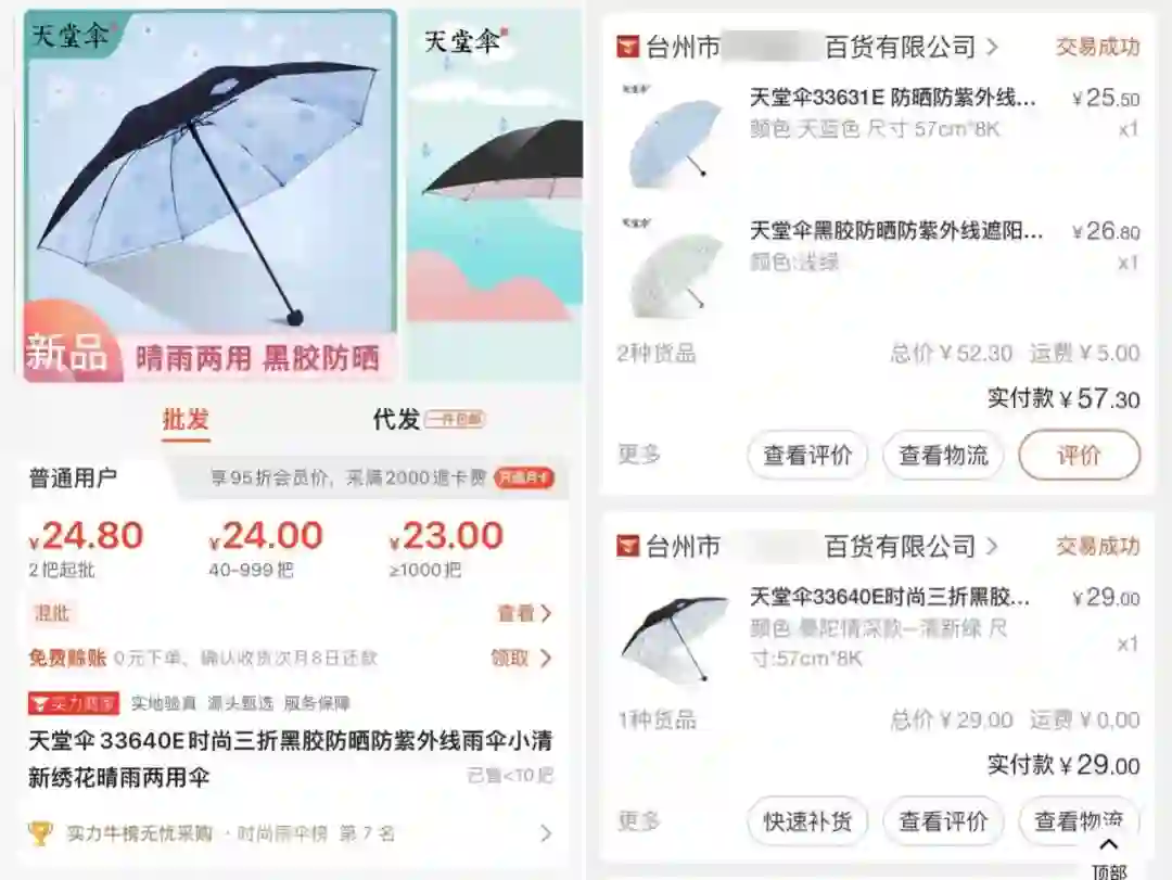 浙江有一些天堂伞的代工厂,遮阳伞的质量很好,伞架比较扛风,伞布也很厚实。最重要的是款式并不难看——零售店常常进一些丑得离奇的款式,每次丢了伞临时买都要撑几个月丑伞。我和朋友一人买了好几把放在不同的包里,避免自己遇上出门忘拿伞的悲剧。