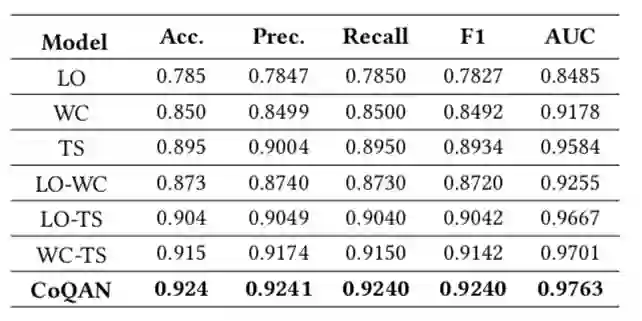 最终在与其它文章质量分模型的比较中,CoQAN取得了比较好的结果: