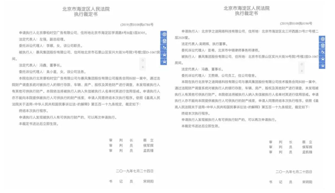 7月25日,《财经天下》周刊从北京法院审判信息网发布的两份裁定书获悉。北京市海淀区人民法院通过财产调查系统对暴风集团股份有限公司(暴风集团)的银行存款、车辆、房产、股权及其他财产进行调查,未发现暴风集团有其他可供执行财产。法院决定将暴风集团纳入失信被执行人名单,对其进行信用惩戒。