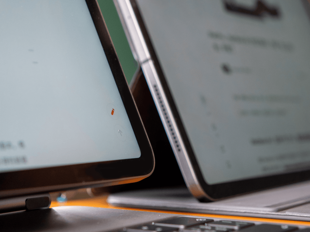 开合角度,我们需要分两部分讲,连接键盘部分的转轴(带有 USB-C 接口那部分)开合角度不到 90 度,可以将 iPad Pro 的高度提高 1cm。也就是说你不能像之前用键盘式智能双面夹那样将键盘壳完全摊平,或翻折到背面使用。尽管只提高了 1cm,但视觉体验也比旧款强不少,而且只有这个地方固定住了,背部转轴提供的悬浮和多角度调节才能实现。