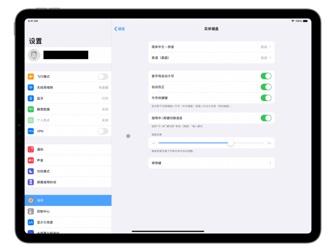 拥有 1mm 键程的键盘手感则要比之前的键盘式智能双面夹好太多,打字感受和 16 英寸 MacBook Pro 基本一样,键盘布局也和 MacBook 差不多,使用了「倒 T 型」方向键,不过由于没有最上方的一排功能键,所以键盘的背光亮度需要到系统设置内调整。