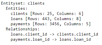 若要标明特征工具中的关联,我们只需指定连接两张表的变量。表 clients 和表 loans 是通过变量 client_id 相关联的,表 loans 和表 payments 通过 loan_id 相关联。可通过如下语法创建关联并将其加入实体集: