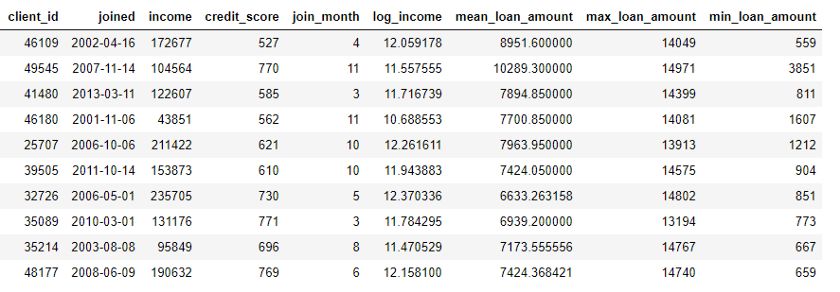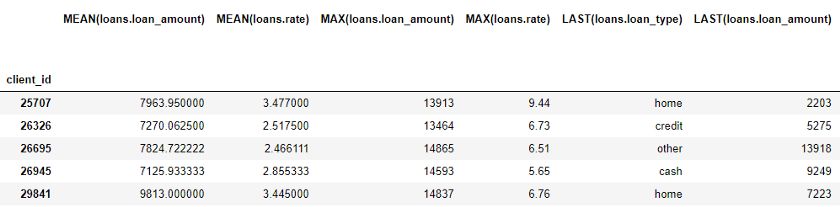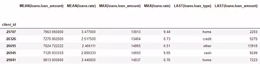 这一过程包括根据不同用户对贷款数据表进行分组,计算聚合后的统计量,然后把结果整合到客户数据中。以下是我们在 Python 中用 Pandas 执行此过程的代码: